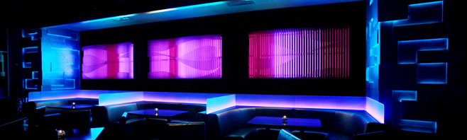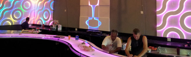 Located in South Beach Miami, Florida. Impact Lighting Inc.fabricated custom galaxy LED lighted walls to be installed at the new night club along with its evermore popular fiberoptic concrete bartops. the LED color changing Galaxy System walls punctuate many of the decorative elements throughout the bar and club.
